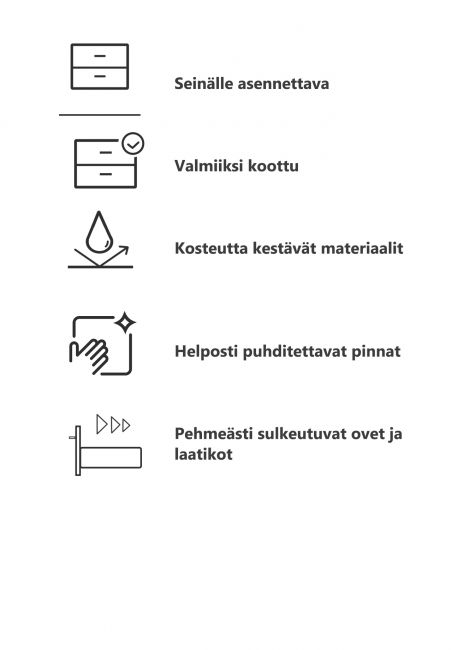 Helppouden vuoksi huonekalut on jo valmiiksi koottu. Sisältää asennustarvikkeet (ruuvit ja ripustimet) tavallista tiiliseinää varten.