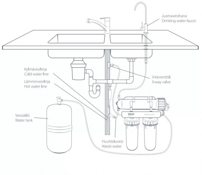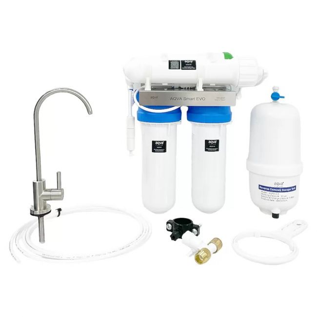 AQVA SMART EVO -käänteisosmoosilaite sijoitetaan tavallisesti tiskiallaskaappiin ja liitetään kylmävesilinjaan tai astianpesukoneen linjaan liittimillä, jotka ovat pakkauksessa mukana. Puhdistettu vesi virtaa pienestä ja tyylikkäästä hanasta, joka asennetaan tiskialtaan yhteyteen. Puhdasvesihana on korkealaatuista ruostumatonta terästä.