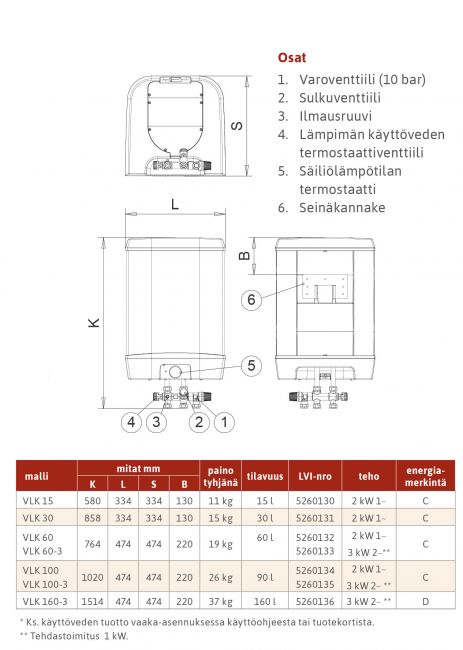 Seinämallinen lämminvesivaraaja on saatavilla 15-160 l tilavuudella. Mallit 15 ja 30 soveltuvat pieneen käyttöveden tarpeeseen; lämmintä vettä riittää käsienpesuun ja tiskiin. Mallien 60-100 vedenlämmittimestä riittää vettä myös suihkuun. Myös lämmitysjärjestelmän vesitilavuuden täydentämiseen sopiva. VLK 160 riittää jo suurempaankin käyttöveden tarpeeseen.