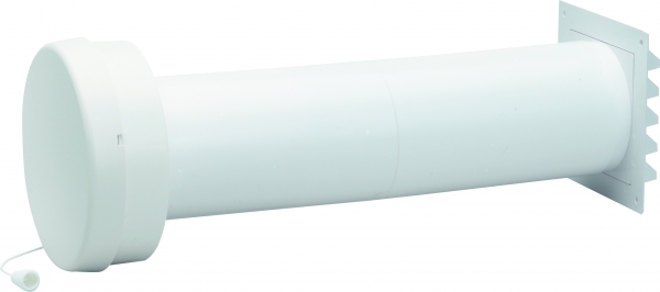 Klassinen korvausilmaventtiili seinäasennukseen. Venttiili avataan ja suljetaan vetonarulla, ilma-aukko säädettävissä.