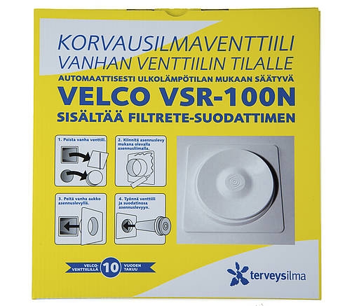 Terveysilman Velco VSR-100N -tuotekokonaisuus sopii käsisäätöisten raitisilmaventtiilien tilalle. Kokonaisuus auttaa palauttamaan asuntoon toimivan ja raikkaan korvausilman ilman epämiellyttävää vetoa. Korvausilmaventtiilit sijoitetaan oleskelutiloihin kuten makuuhuoneisiin, olohuoneeseen ja saunaan. Paketti sisältää termostaatilla varustetun Velco-korvausilmaventtiilin, F7-luokan Filtrete-suodattimen, asennuslevyn sekä asennusliiman.