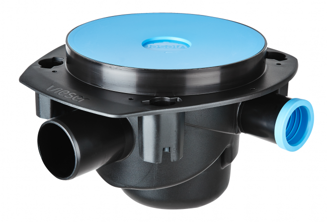 Vieser One lattiakaivo ilman valutukea. Kaivossa on kolme 32/40 mm avattavaa sivuliitäntää. Pakkaus sisältää kaivon, vesilukon, valusuojan, kiilarenkaan, tiivisteen sekä kiilarenkaan asennustyökalun.