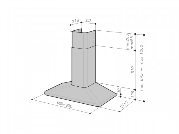 - 600/900 x 500 x 845–1520 mm (l x s x k) jatkoputkella
