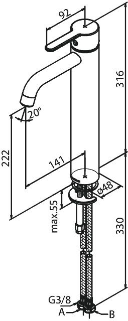 Korkeus tasosta hanan suuttimen alaosaan 222 mm