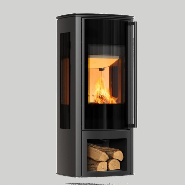 AB ENYO VIEW on moderni vapaasti seisova takka puusäilytys tilalla. Kolmisivuisen lasituksen ansiosta liekit näkyvät täydellisesti huoneen jokaisesta nurkasta, mikä luo ainutlaatuisen valospektaakkelin. Lieriömäinen muoto ja minimalistinen muotoilu tekevät takasta minkä tahansa sisustuksen keskipisteen – loft-tyylistä skandinaaviseen tyyliin.