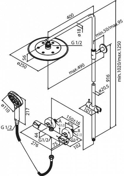 Damixa Sadesuihkusetti Silhouet termostaattihanalla teräs