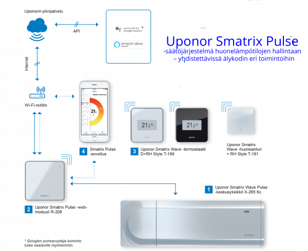 Uponor Smatrix Pulse – uuden ajan lattialämmitysjärjestelmä, joka on yhteensopiva monien eri älykotisovellusten kuten Alexa- ja Google* -puheavustajien kanssa.