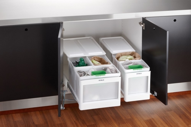 Stala EkoLinen lisävarusteena on saatavissa ovimekanismi. Sen avulla roska-astiat liukuvat ulos, kun kaapin ovi avataan.