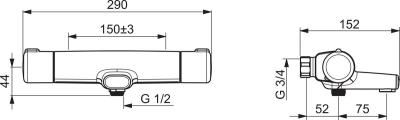 Termostaattinen suihkuhana juoksuputkella. Lämmönsäätökahvassa on lämpötilarajoitin, joka voidaan ohittaa nappia painamalla. EcoFlow -virtaamasäädin. Hanassa on roskasihdit ja yksisuuntaventtiilit. Mattamusta.