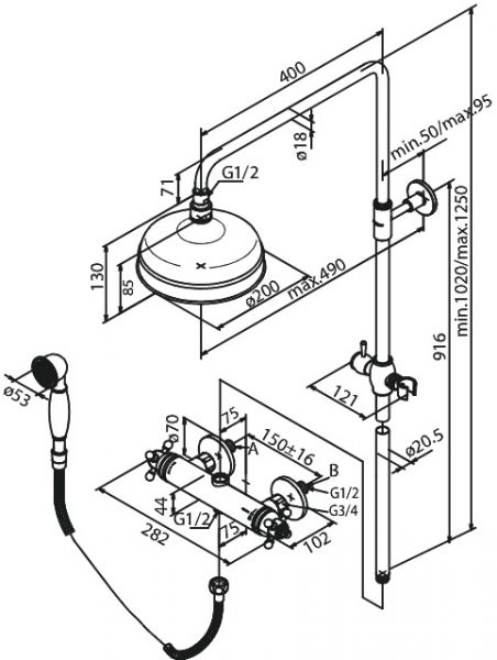 - Sisältää, teleskooppisen suihkuputken, -letkun, yläsuihkun ja yksitoimisen käsisuihkun