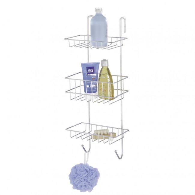Kromista valmistettu Revigo suihkuhyllykkö ripustetaan suihkuseinään roikkumaan koukuistaan. Koukut eivät aiheuta ikäviä jälkiä suihkuseinääsi, sillä ne on suojattu silikonisella pehmusteella. Hyllykössä on kolme tilavaa koria sekä kaksi koukkua esimerkiksi pesusienten tai -harjojen säilytystä varten.