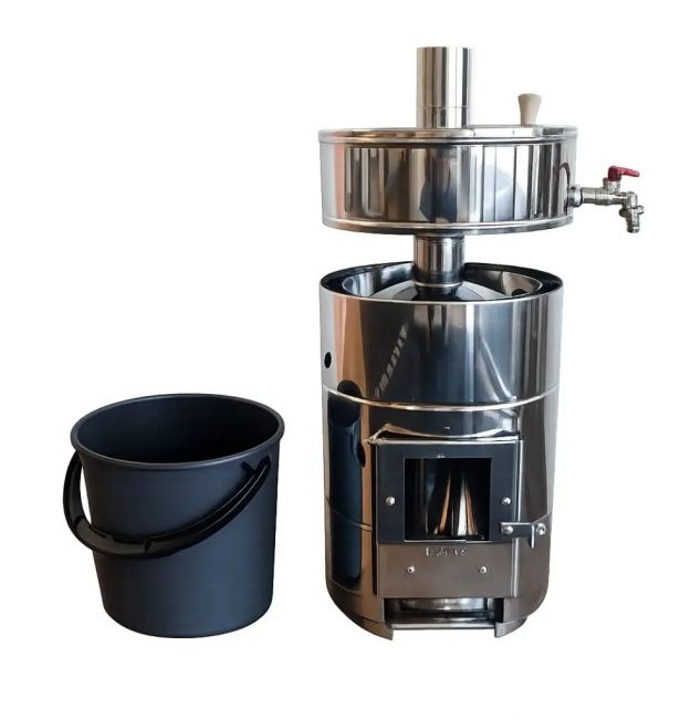 Materiaali: ruostumaton teräs. Kiuas ei tarvitse kiviä – tyulipesän ympärillä on höyrystinrenkaat, jotka tuottavat löylyn. Piippu ja sadehattu mahtuvat kiukaan sisälle.