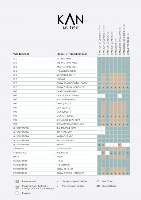 - Katso mihin wc-istuimeen kansi käy: Yhteensopivuustaulukko kuvassa (yllä)
